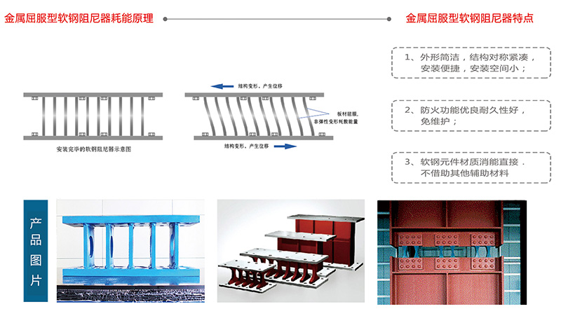 1、利用软钢板的剪切变形耗能原理而研制的一种阻尼器,主要是由上下连接板和中间剪切耗能钢板通过焊接或螺栓连接组成。其耗能原理:在水平荷载作用下由于结构层间产生大的变形带动钢板发生剪切变形,产生塑性屈服来消耗传入的能量从而达到耗能减震目的。